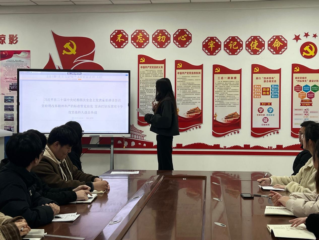我院学生第三党支部通过集体学习、交流研讨等多种形式开展主题党日活动,全体党员深入领会了习近平总书记在二十届中央纪委四次全会上发表的重要讲话精神及《健全全面从严治党体系》的核心要义。大家纷纷表示,要切实把思想和行动统一到党中央决策部署上来,不断增强全面从严治党的政治自觉和行动自觉。以此次活动为契机,继续深化学习、积极实践,努力将学习成果转化为推动学院发展和个人成长的实际行动,为全面从严治党贡献自己的青春力量。