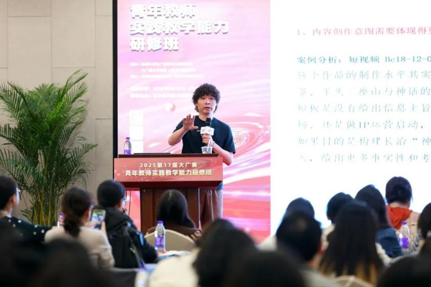 在开班仪式上,全国大学生广告艺术大赛组委会副主任、秘书长刘瑞武教授发表讲话。刘秘书长强调,在党和国家高度关注青年人才培养、大力推进产教融合新型育人体系建设的战略背景下,大广赛肩负着培育创新创意人才的重大历史使命。她鼓励各位老师积极借助AI工具,为大广赛精心创作专属IP形象以及一系列衍生文创产品,并呼吁老师们积极动员学生团队踊跃参与到创作中来。最后,刘秘书长对全体教师寄予厚望,勉励大家严守培训纪律,深入交流、相互借鉴,将此次研修的学习成果有效运用到赛事指导中,助力学子们取得优异成绩。