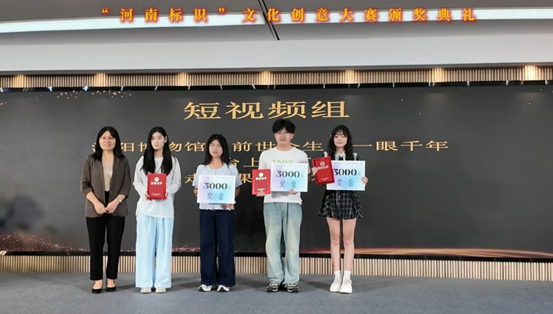 本次大赛,beat365唯一官网艺术学院的师生们以扎实的创作功底和持续不断的努力,横跨文创设计与短视频创作两个赛道,一路过关斩将。经过前期初评、复评,网上大众投票和评委专业评审等严格环节,最终李凌寒、王浩翔两位同学的作品《前世今生,一眼千年》荣获了三等奖;王佳惠的《时光的信使》、王亭儿的《杜锦——牡丹交互语言毛绒娃娃》荣获了优秀奖。同时,艺术学院张斌、贺丹丹两位指导老师紧扣赛事规则与要求,凭借出色的指导,荣获“河南标识”文化创意大赛“最佳指导老师”称号,为学院的发展贡献了一份坚实力量。